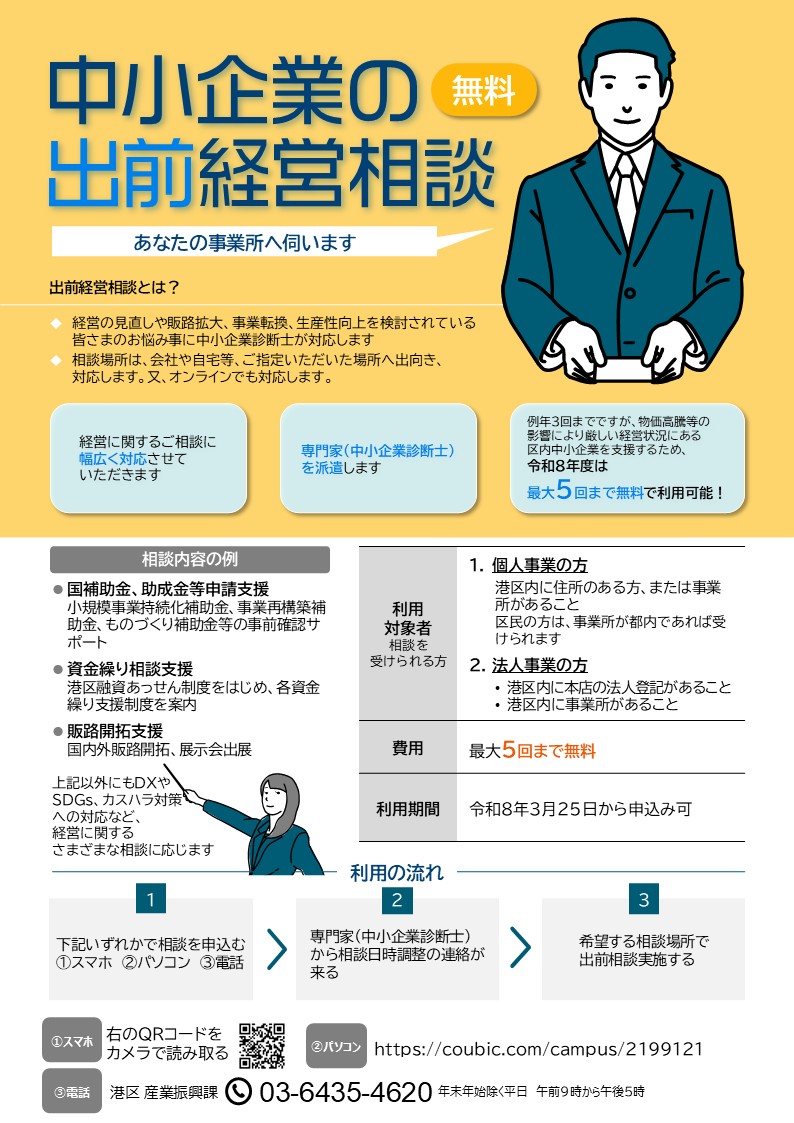 経営の見直しや新事業への進出、経営の効率化、さらにはカスハラ対策など、様々な課題や悩みを抱える小企業に、区が中小企業診断士等を派遣します。専門家は3回まで、直接企業を訪問しアドバイスを行います。ただし、物価高騰等の影響により苦境に立つ区内中小企業を強力に支援するため、令和8年度も利用可能枠を増枠し、最大5回までご利用いただけます。