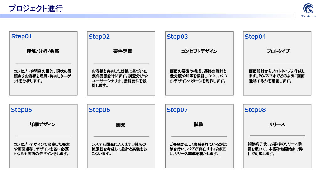 システムを開発するときには、お客様の様々な状況を理解・分析し、事業コンセプトのデザインから支援することを大事にしています。システムは事業そのものが成り立たなければ意味がないため、その部分から一緒に考え、プロトタイプを作成し、その後、詳細設計、デザイン、開発、試験、リリースという流れで進みます。
