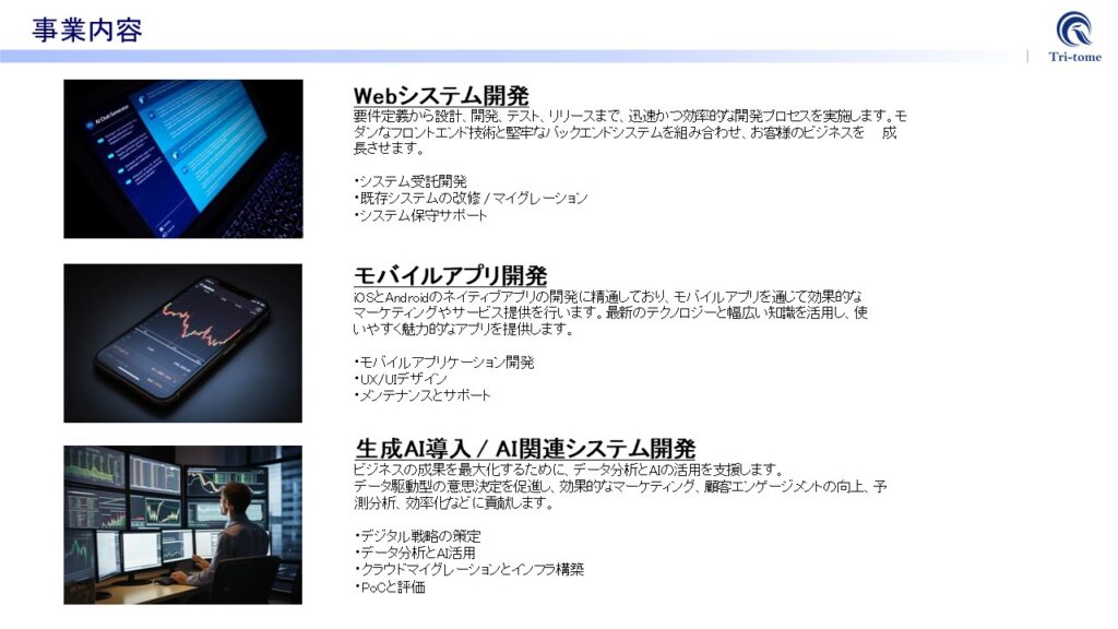 事業内容は主にウェブシステム開発、モバイルアプリ開発、そして最近では生成AIの導入やAI関連システム開発を行っており、これら3つの事業で売上の約8割を占めています。 特に得意としているのは、顧客管理システムや予約系のアプリ、イベントでの集客管理システムです。