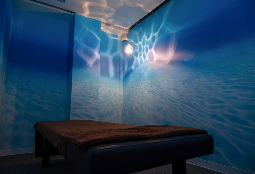 整体サロンは大門にあり、海の部屋と森の部屋という2つのコンセプトの部屋を用意しています。森の部屋は、入ると壁一面の樹木に囲まれていて、森の香りに包まれながら鳥や虫の声が聞こえるなど、まるで森の中にいるような体験ができます。海の部屋は、浅瀬に浮かんでゆったりと何も考えずに時間を過ごしているような気分になれる空間です。波の音と海の香りがして、室温は海の中のように少し温かい感じにしています。お客さんにも喜んでいただいていますね。