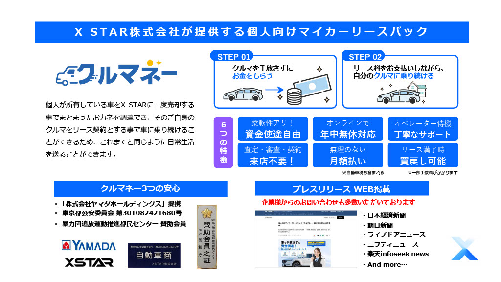 当社では「クルマネー」という、日本ではユニークなマイカーリースバックのサービスを提供しています。これはお客様が当社に車を売ることでまとまったおカネを得た後、その愛車をリース契約する形でそのまま乗り続けられるという仕組みです。
