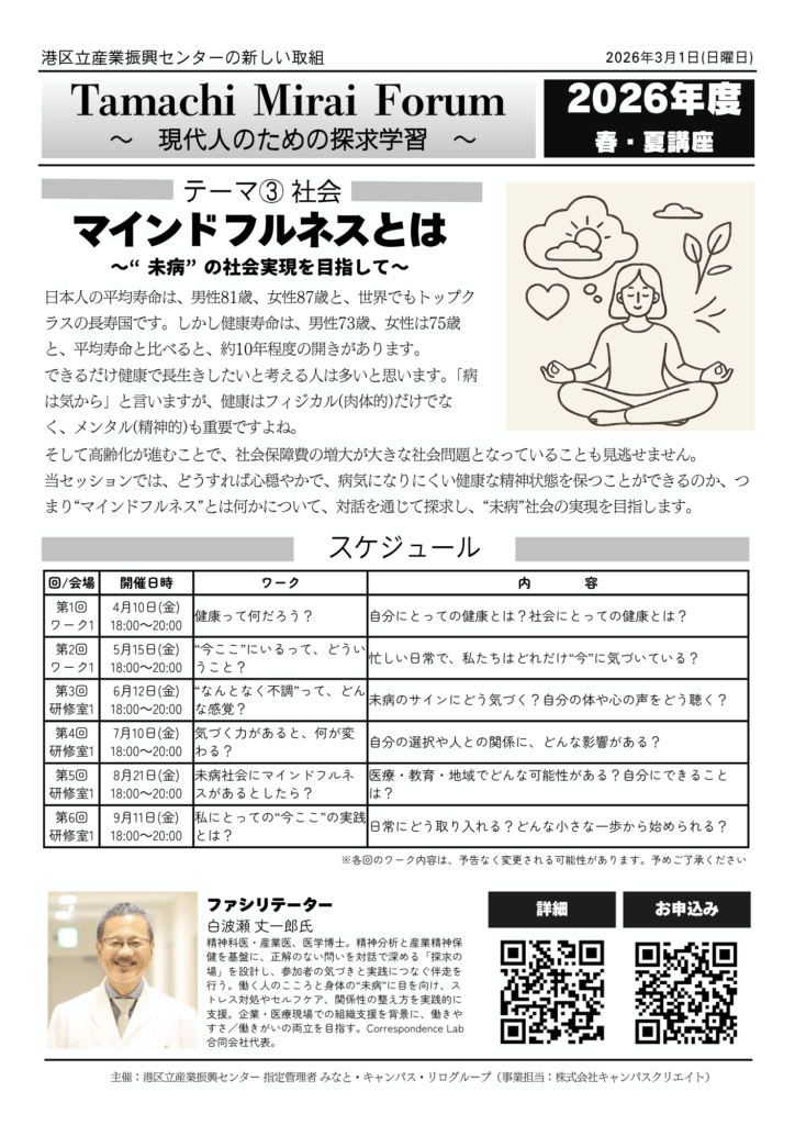 <セッション内容(予定)> 第1回「健康って何だろう?」 自分にとっての健康とは?社会にとっての健康とは? 第2回「“今ここ”にいるって、どういうこと?」 忙しい日常で、私たちはどれだけ“今”に気づいている? 第3回「“なんとなく不調”って、どんな感覚?」 未病のサインにどう気づく?自分の体や心の声をどう聴く? 第4回「気づく力があると、何が変わる?」 自分の選択や人との関係に、どんな影響がある? 第5回「未病社会にマインドフルネスがあるとしたら?」 医療・教育・地域でどんな可能性がある?自分にできることは? 第6回「私にとっての“今ここ”の実践とは?」 日常にどう取り入れる?どんな小さな一歩から始められる? ※内容は現時点での予定です。予告なしに変更される可能性がありますので、予めご了承ください
