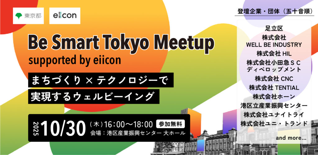 都民の暮らしの利便性・QOLを高める新しいサービスを、スピーディに生み出すことを目的に、東京都が推進する事業「Be Smart Tokyo」。その採択事業者であるeiiconが、まちづくりやウェルビーイングに関わる企業同士の連携を促進するためのミートアップイベントを開催いたします!