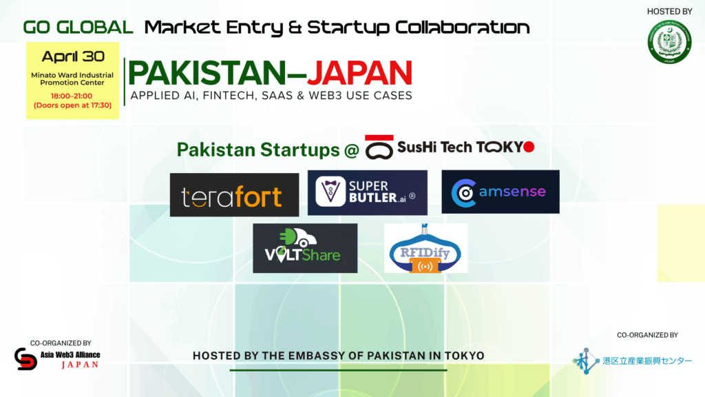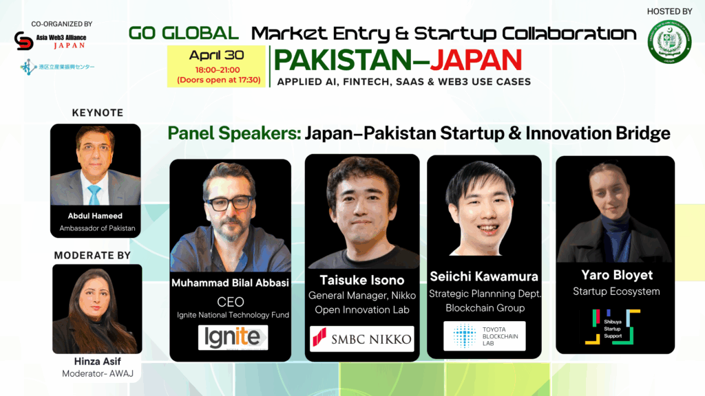 今回の 「Go Global: Pakistan–Japan」 では、パキスタンのスタートアップエコシステムを支えるイノベーション環境、政策、基盤について掘り下げていきます。また、イノベーションを牽引するスタートアップや主要関係者を紹介し、応用AI、FinTech、SaaS、Web3といった分野において、パキスタンと日本のテックコミュニティが学び、交流し、協力関係を築くためのプラットフォームを提供します。