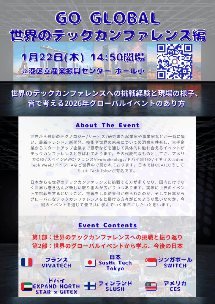 港区立産業振興センター主催、【GO GLOBAL 世界のテックカンファレンス編】世界各国におけるスタートアップエコシステムのキーパーソンと繋がるセミナーの第20弾となります。