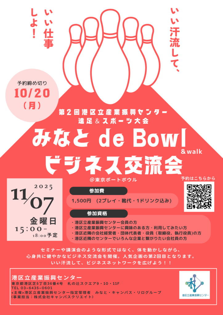 (最寄駅:最寄駅 JR田町駅三田口(西口)から徒歩4分、都営地下鉄三田駅A1・A2出口徒歩2分(A1出口は7:00~21:00利用可))会場:東京ポートボウル https://www.tokyoportbowl.com/