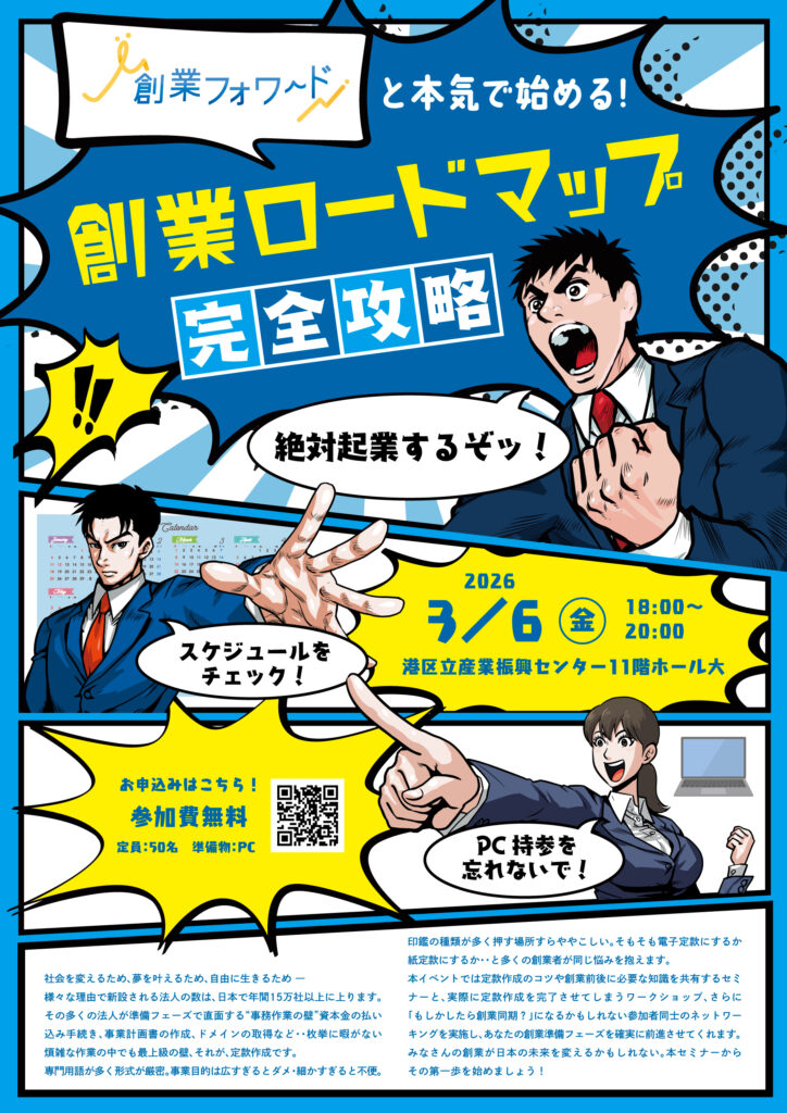 本イベントでは定款作成のコツや創業前後に必要な知識を共有するセミナーと、実際に定款作成を完了させてしまうワークショップ、さらに「もしかしたら創業同期?」になるかもしれない参加者同士のネットワーキングを実施し、あなたの創業準備フェーズを確実に前進させてくれます。
