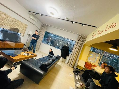 (定期的に社員全員が会社に集まり、会社の計画について話し合う様子)